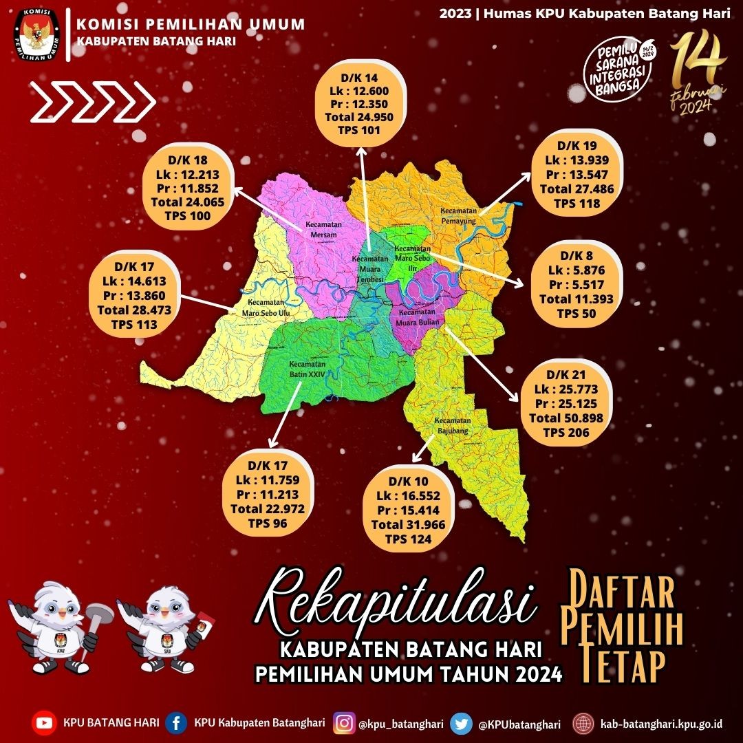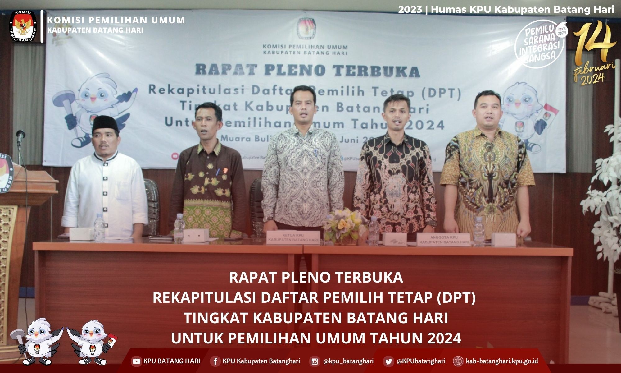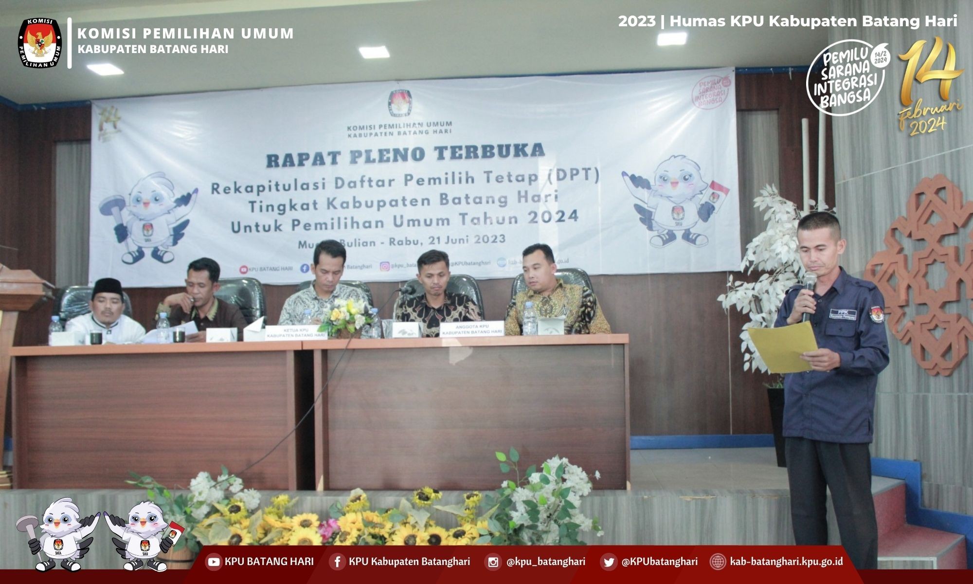 Rapat Pleno menetapkan jumlah DPT di Kabupaten Batang Hari sebanyak 222.203 Pemilih dengan jumlah Pemilih Laki-laki sebanyak 113.325 Pemilih dan Perempuan sebanyak 108.878 Pemilih yang tersebar di 908 TPS dalam Kabupaten Batang Hari. Penetapan tersebut dituangkan dalam Berita Acara Nomor 150/PL.01.2 -BA/1504/2023 dan dibacakan langsung oleh Ketua KPU Kabupaten Batang Hari.