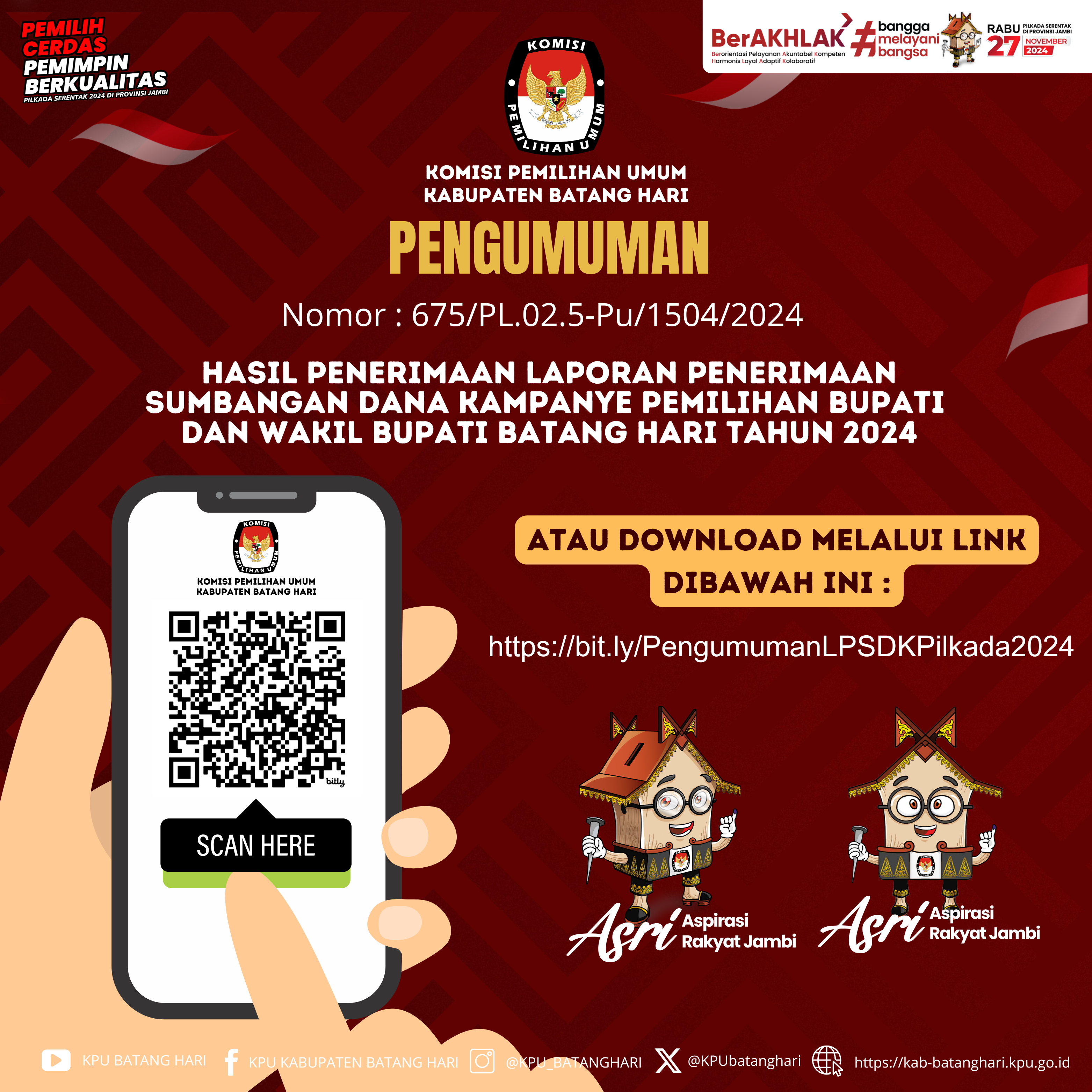 PENGUMUMAN HASIL PENERIMAAN LAPORAN PENERIMAAN SUMBANGAN DANA KAMPANYE PEMILIHAN BUPATI DAN WAKIL BUPATI BATANG HARI TAHUN 2024