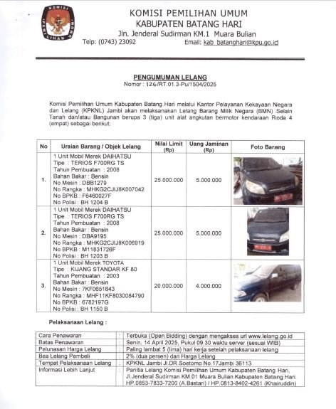 Muara Bulian, KPU Kabupaten Batang Hari melalui Kantor Pelayanan Kekayaan Negara dan Lelang (KPKNL) Jambi akan melaksanakan penjualan dimuka umum/lelang berupa Barang Milik Negara selain Tanah dan/atau bangunan berupa 3 (tiga) unit alat angkutan bermotor kendaraan roda 4 (empat) melalui website www.lelang.go.id.