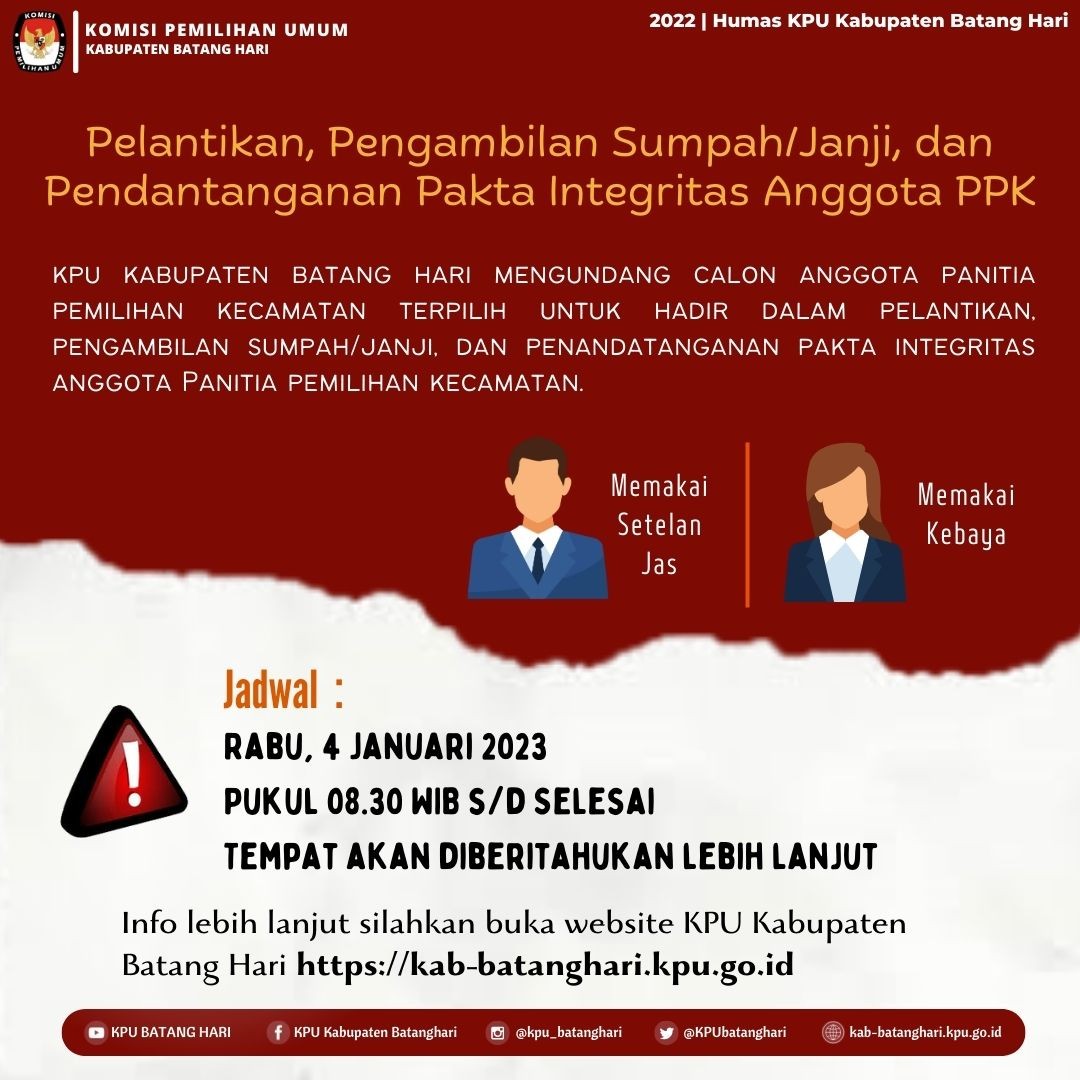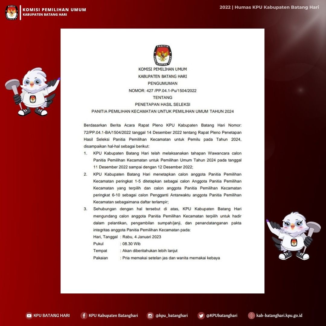 Selamat kepada PPK terpilih, selamat bergabung menjadi Penyelenggara Pemilu Tahun 2024. Selanjutnya KPU Kabupaten Batang Hari mengundang PPK terpilih untuk hadir pada acara Pelantikan, pengambilan sumpah/janji dan penandatanganan pakta integritas.