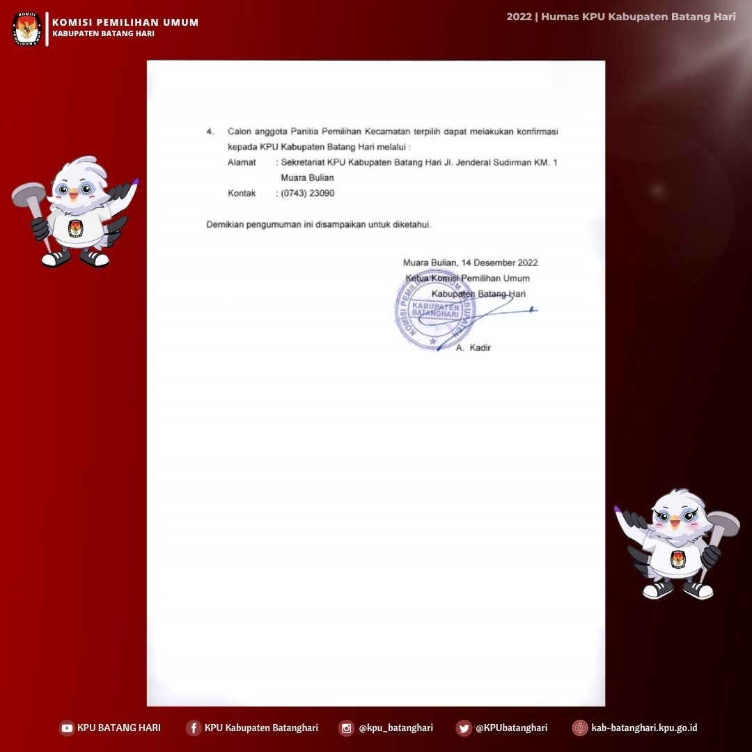 Muara Bulian (14/12), KPU Kabupaten Batang Hari telah menetapkan hasil seleksi Panitia Pemilihan Kecamatan untuk Pemilihan Umum Tahun 2024 melalui Berita Acara Rapat Pleno KPU Kabupaten Batang Hari Nomor : 72/PP.04.1-BA/1504/2022 tanggal 14 Desember 2022, download pengumuman selengkapnya disini