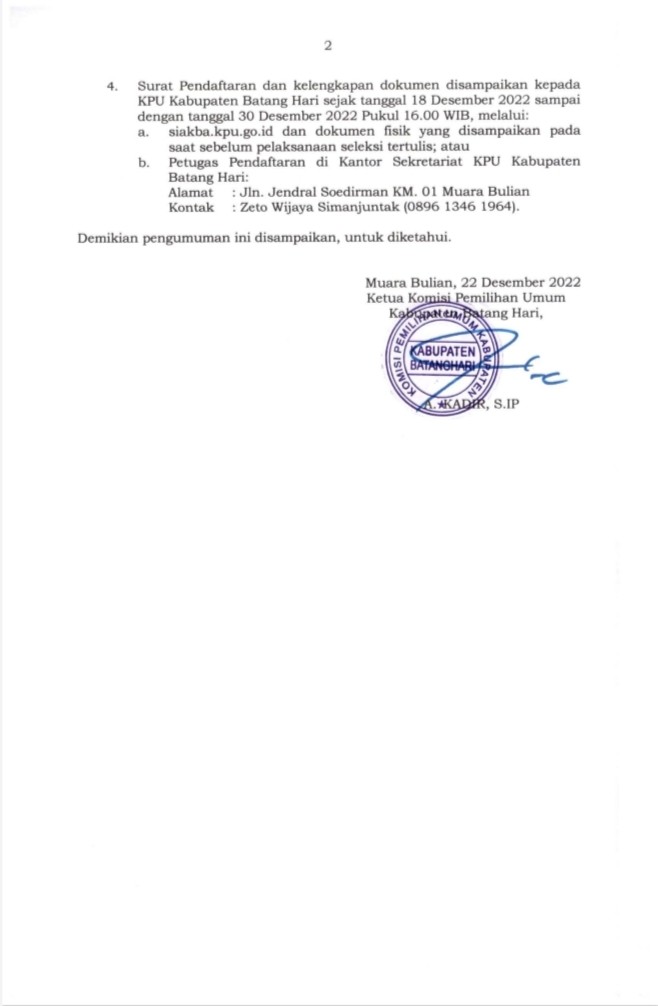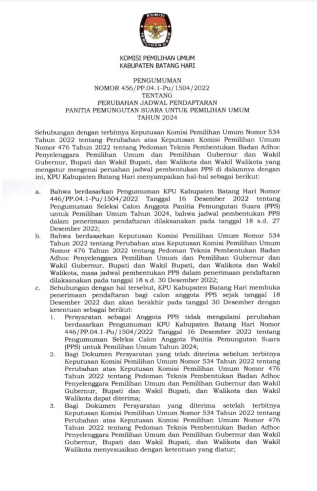 Sehubungan dengan terbitnya Keputusan Komisi Pemilihan Umum Nomor 534 Tahun 2022 tentang Perubahan atas Keputusan Komisi Pemilihan Umum Nomor 476 Tahun 2022 tentang Pedoman Teknis Pembentukan Badan Adhoc Penyelenggara Pemilihan Umum dan Pemilihan Gubernur dan Wakil Gubernur, Bupati dan Wakil Bupati, dan Walikota dan Wakil Walikota, berikut kami sampaikan Pengumuman Nomor 456/PP.04.1-Pu/1504/2022 tentang Perubahan Jadwal Pendaftaran Panitia Pemungutan Suara Untuk Pemilihan Umum Tahun 2024 :