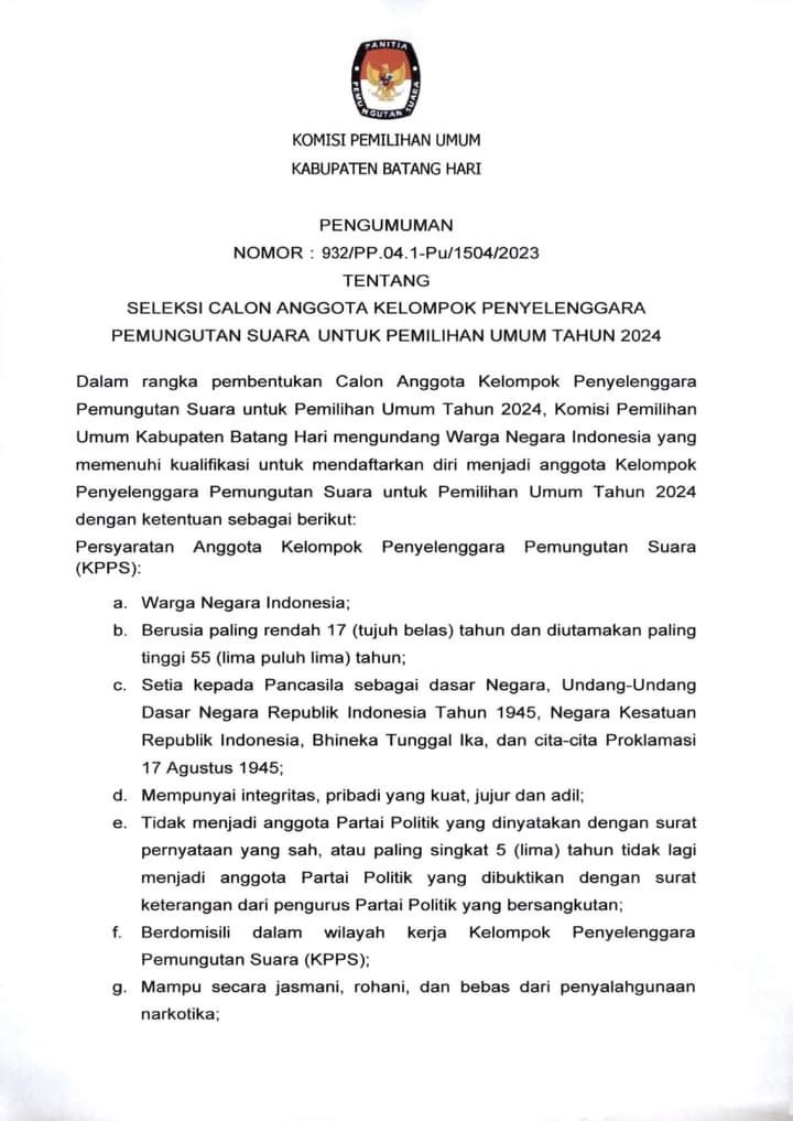 PENGUMUMAN SELEKSI CALON ANGGOTA KPPS UNTUK PEMILIHAN UMUM TAHUN 2024