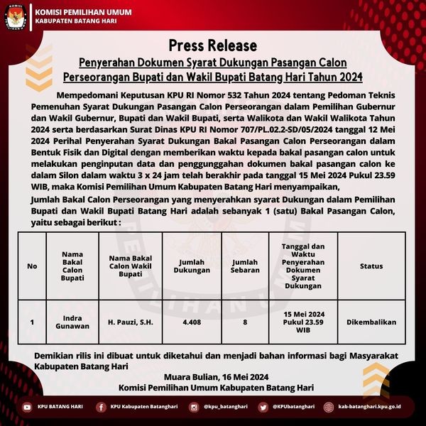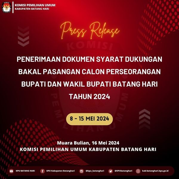 PRESS RELEASE PENERIMAAN SYARAT DUKUNGAN BAKAL PASANGAN CALON PERSEORANGAN PEMILIHAN BUPATI DAN WAKIL BUPATI BATANG HARI TAHUN 2024