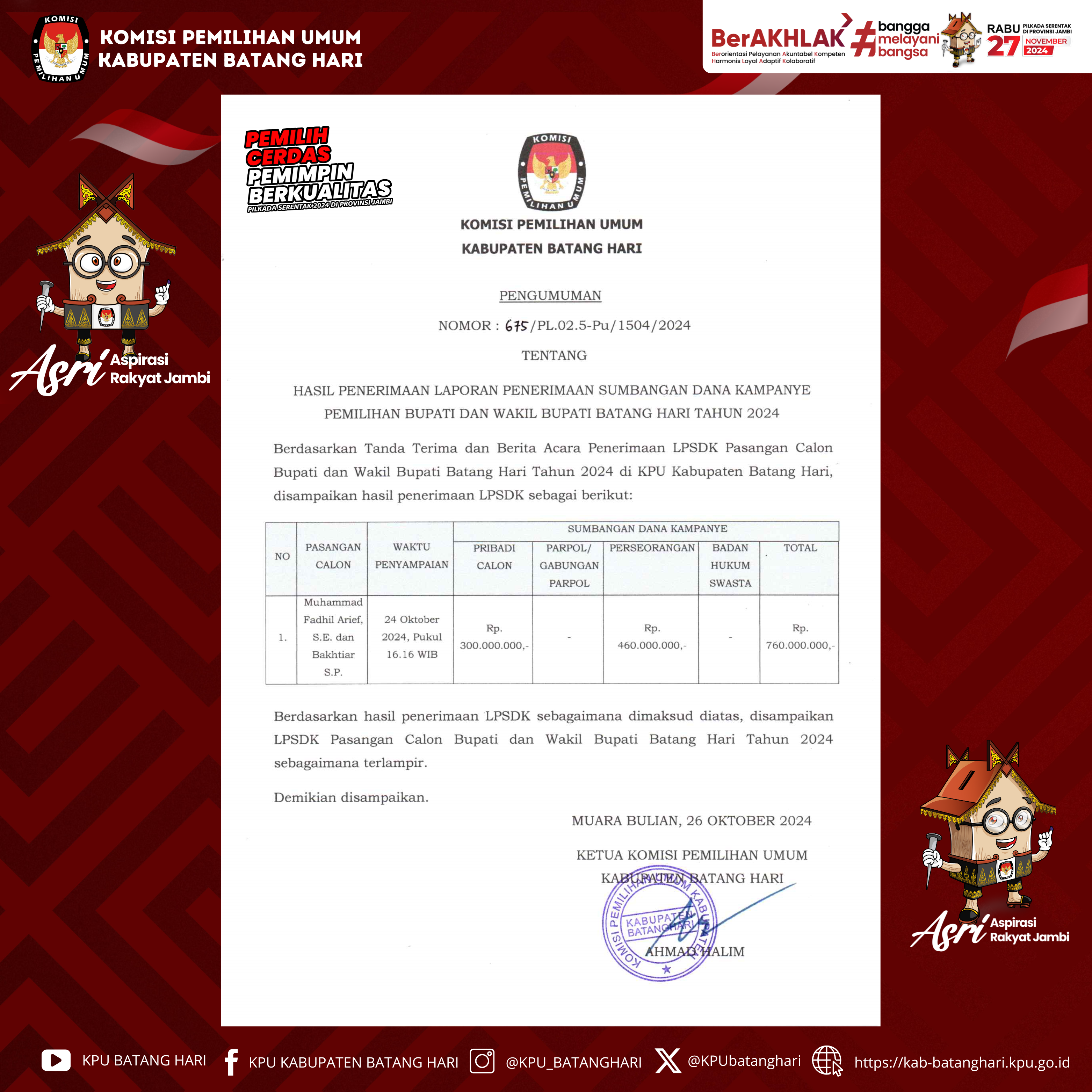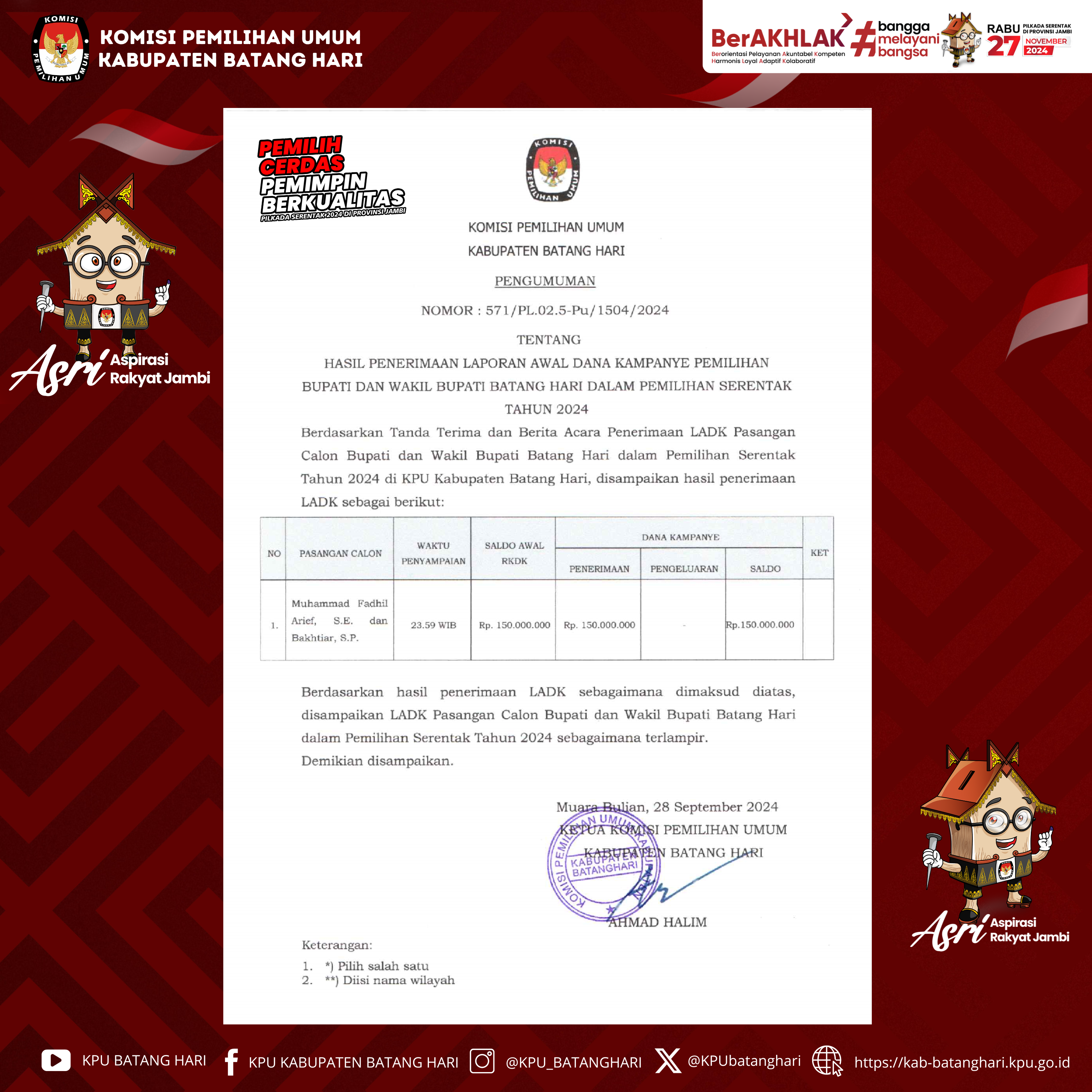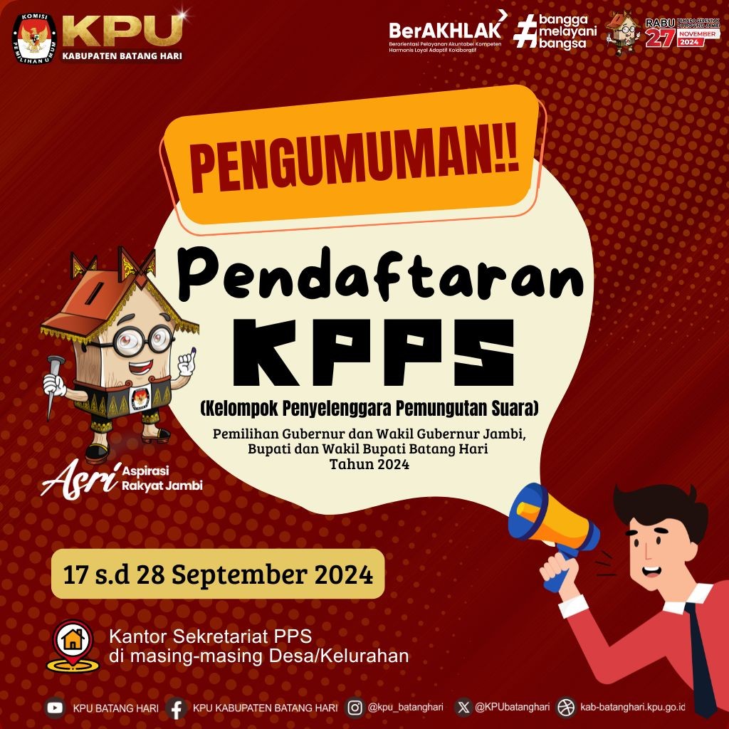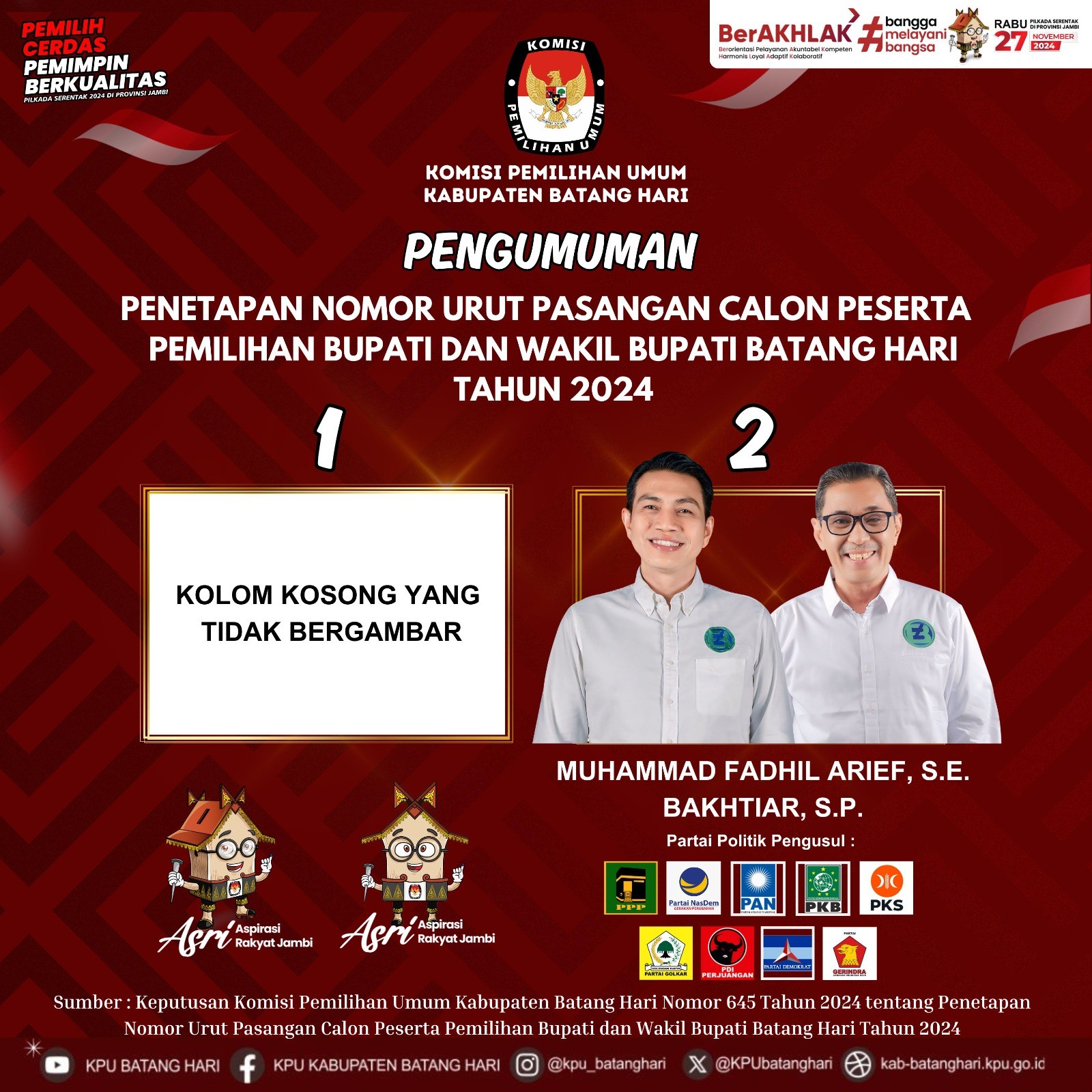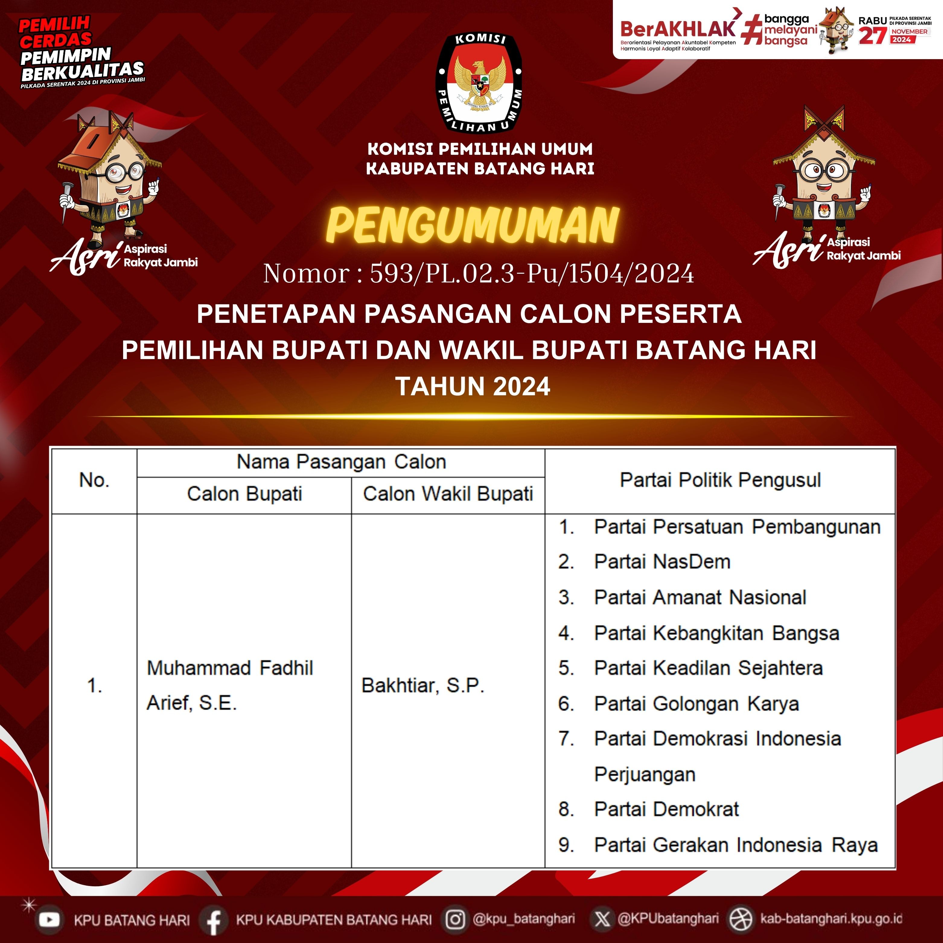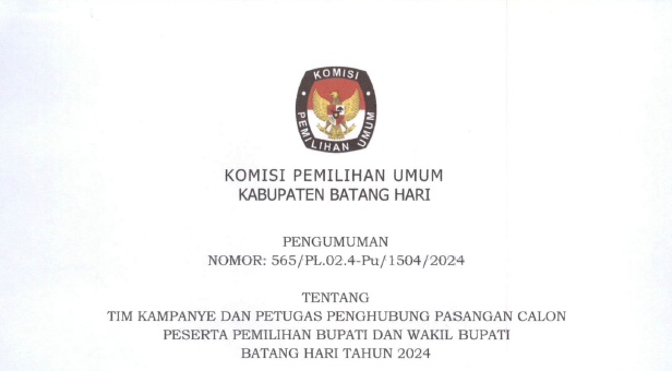 Berdasarkan Peraturan Komisi Pemilihan Umum Peraturan Komisi Pemilihan Umum Nomor 13 Tahun 2024 tentang Kampanye Pemilihan Gubernur dan Wakil Gubernur, Bupati dan Wakil Bupati, serta Walikota dan Wakil Walikota, maka dengan ini Komisi Pemilihan Umum Kabupaten Batang Hari mengumumkan Tim Kampanye dan Petugas Penghubung Pasangan Calon Bupati dan Wakil Bupati Batang Hari Tahun 2024 Nomor Urut 2, Muhammad Fadhil Arief, S.E dan Bakhtiar, S.P