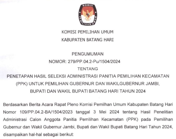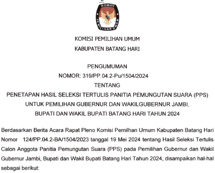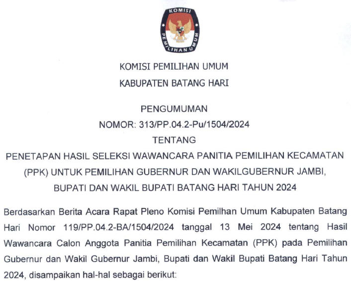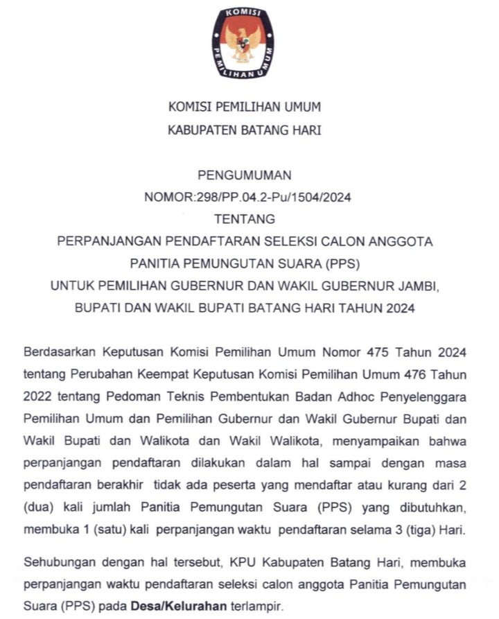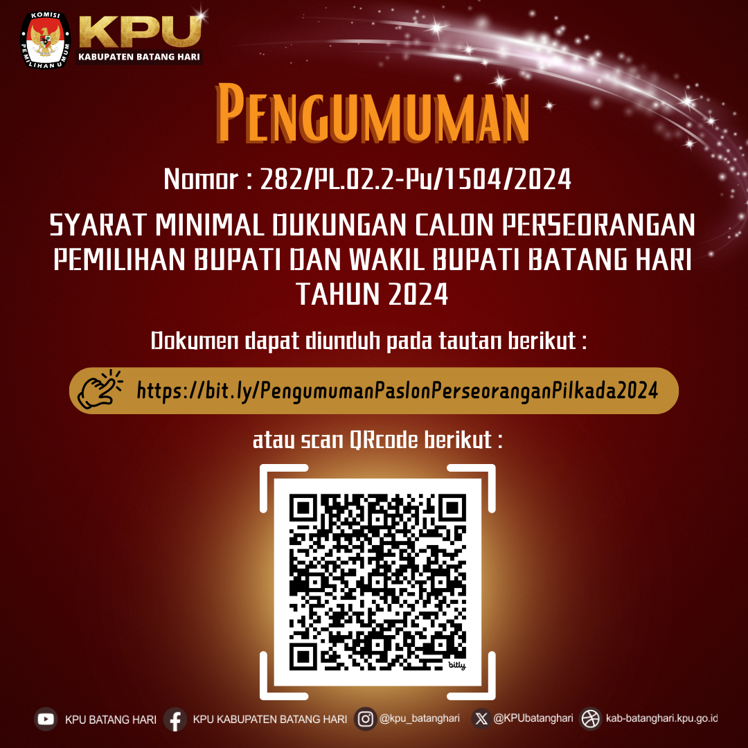 UNDUH PENGUMUMAN NOMOR : 282/PL.02.2-Pu/1504/2024 TENTANG SYARAT MINIMAL DUKUNGAN CALON PERSEORANGAN PEMILIHAN BUPATI DAN WAKIL BUPATI BATANG HARI TAHUN 2024 DAN FORMULIR SELENGKAPNYA MELALUI Pengumuman dan Dokumen Syarat Dukungan Pasangan Calon Perseorangan