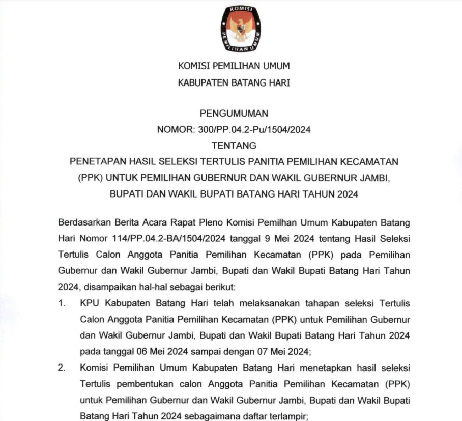Muara Bulian, Minggu (5/5) Berikut kami umumkan Syarat Minimal Dukungan Calon Perseorangan Pemilihan Bupati dan Wakil Bupati Batang Hari Tahun 2024.