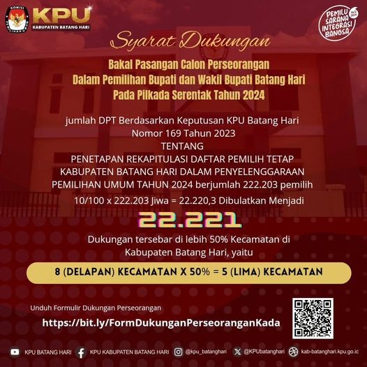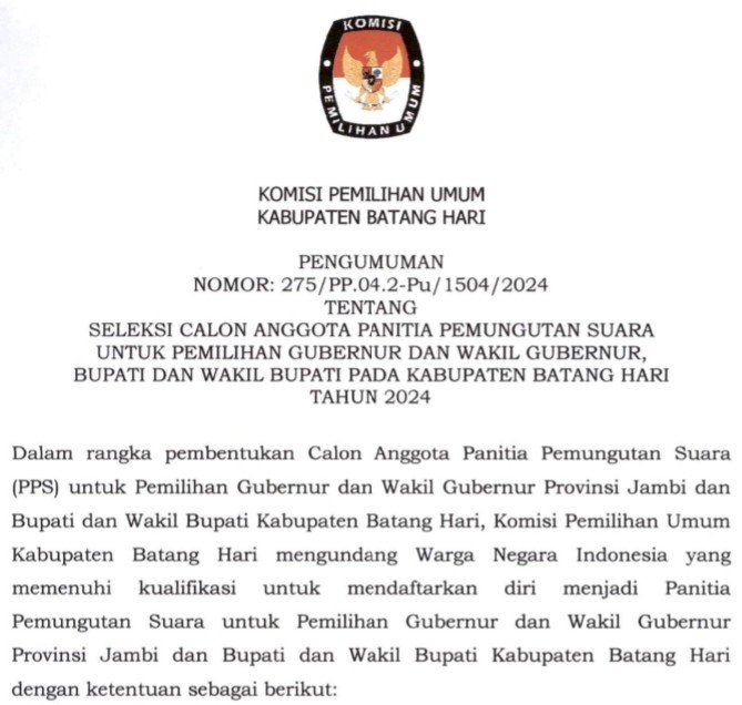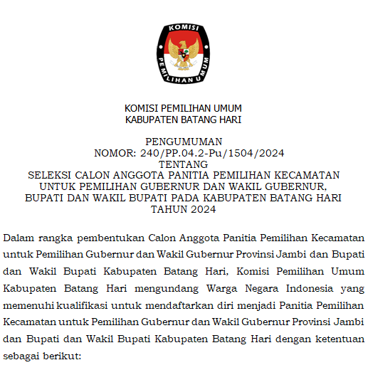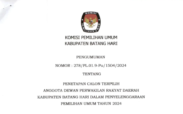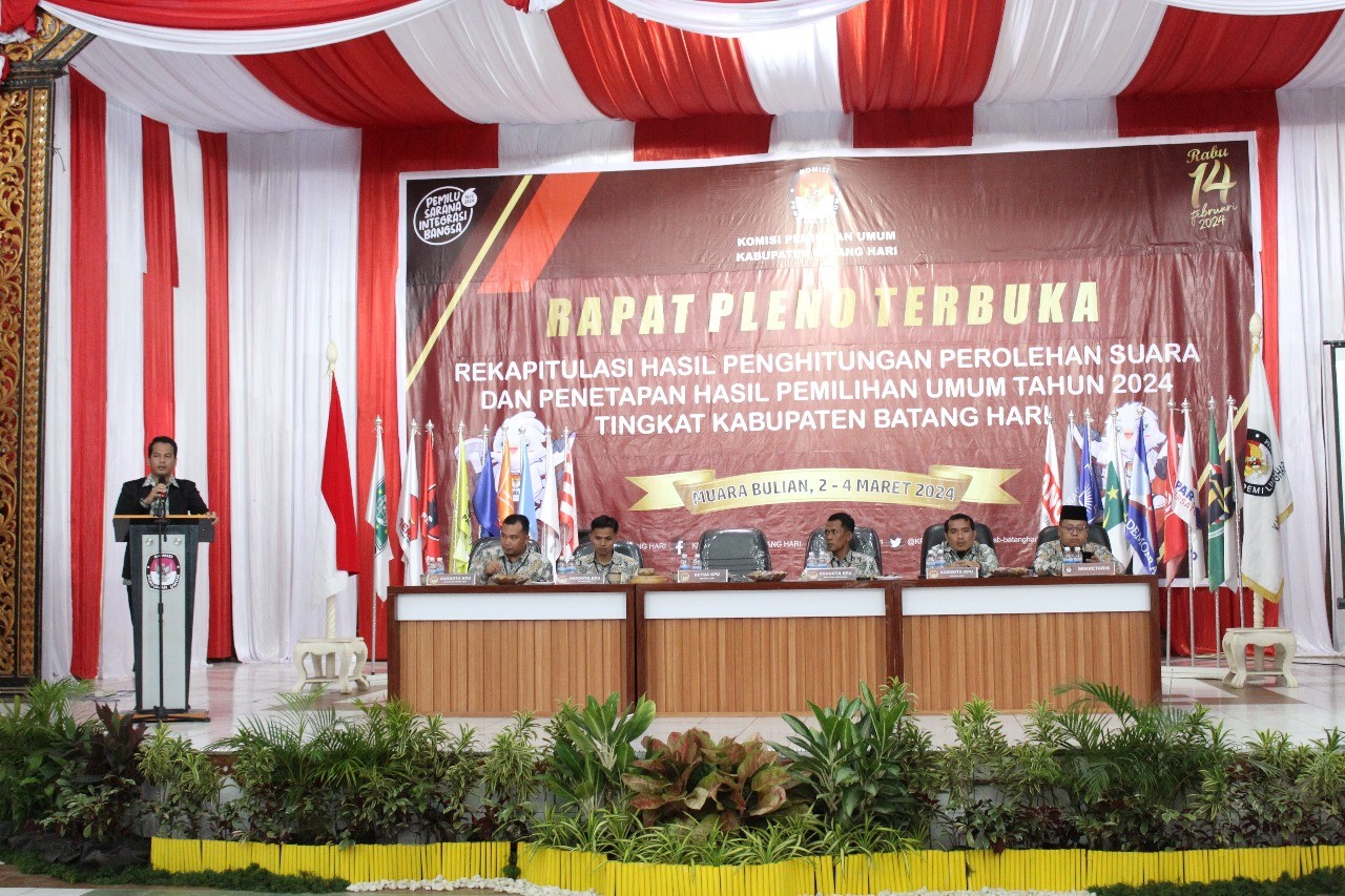 Muara Bulian, Komisi Pemilihan Umum Kabupaten Batang Hari telah melaksanakan Rapat Pleno Terbuka Rekapitulasi Hasil Penghitungan Perolehan Suara dan Penetapan Hasil Pemilihan Umum Tahun 2024 Tingkat Kabupaten Batang Hari pada 2-4 Maret 2024. Rapat Pleno tersebut dihadiri oleh Saksi Pasangan Calon Presiden dan Wakil Presiden, Saksi Partai Politik, Saksi Calon Anggota DPD, Bawaslu Kabupaten Batang Hari dan Panitia Pemilihan Kecamatan (PPK) se-Kabupaten Batang Hari.
